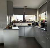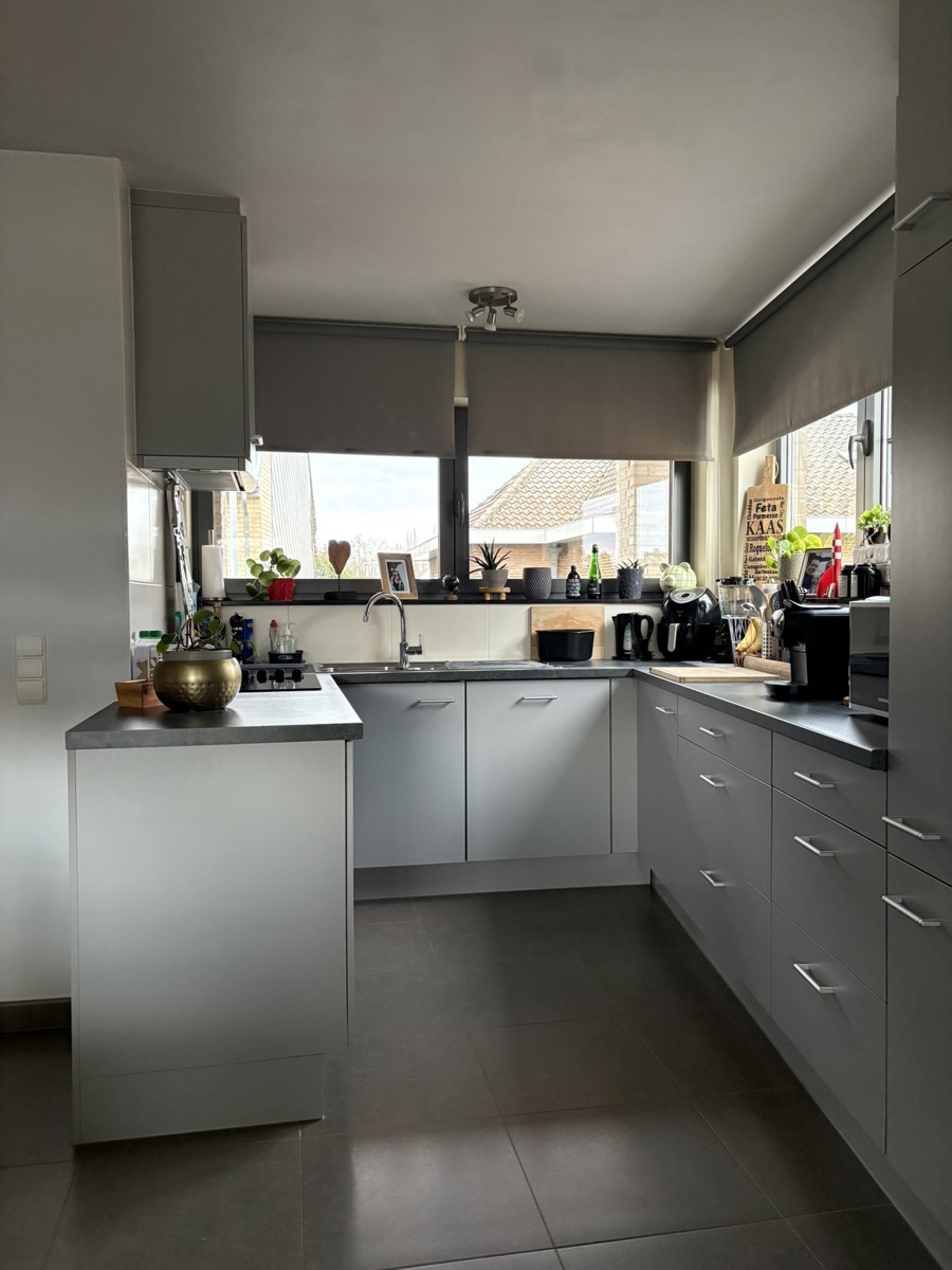 De keuken is geïnstalleerd en uitgerust met de nodige toestellen, waaronder een vaatwasser, ingebouwde koelkast en een aparte diepvriezer. Naast de keuken bevindt zich een praktische bergruimte voor extra opslag.