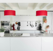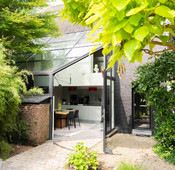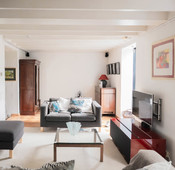 Achteraan bevindt zich een ingerichte keuken, voorzien van hoogwaardige toestellen. De grote raampartijen zorgen voor veel lichtinval en verbinden de woning met de tuin. De woning onderscheidt zich door zijn hoogwaardige afwerking en tal van ingemaakte kasten, die zorgen voor een strak en ordelijk interieur. Op de 1ste V bevindt zich: een gezellig salon met een bureauhoek (ideaal voor thuiswerk), een stijlvolle badkamer met lavabo en douche, en een ruime lichtrijke slaapkamer.