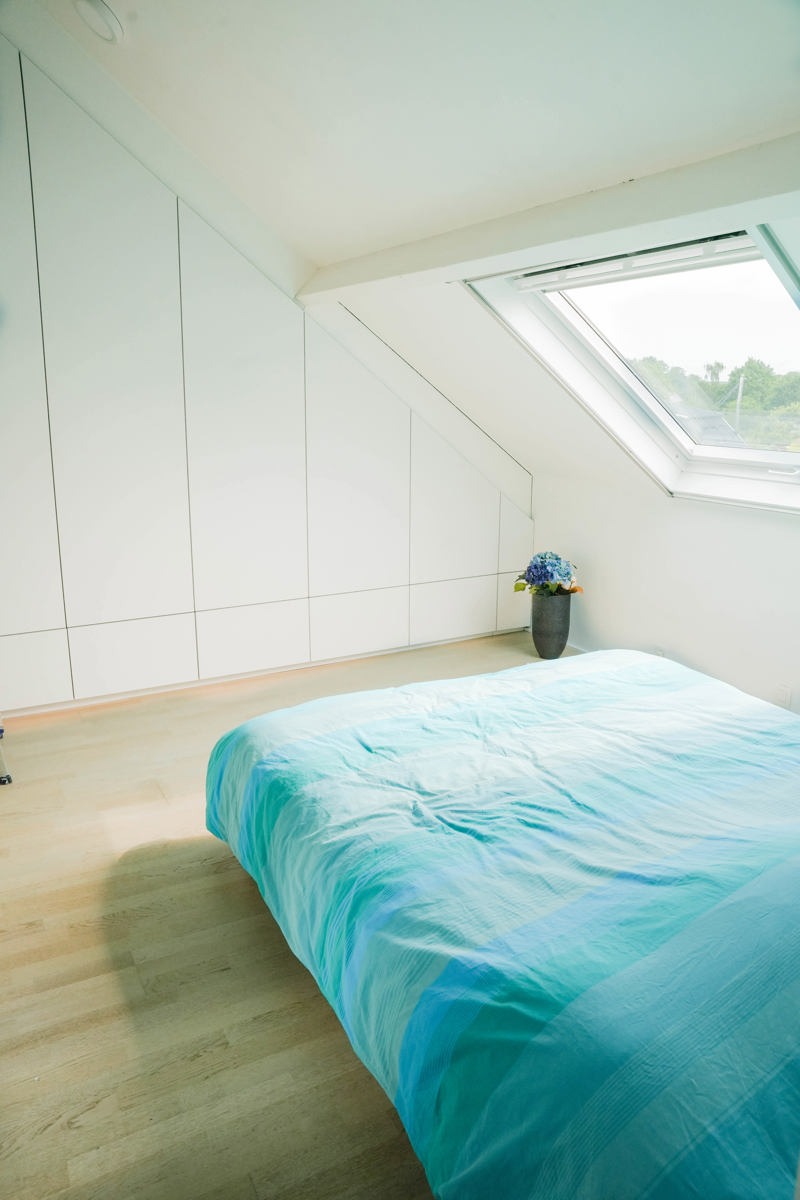 Achteraan bevindt zich een ingerichte keuken, voorzien van hoogwaardige toestellen. De grote raampartijen zorgen voor veel lichtinval en verbinden de woning met de tuin. De woning onderscheidt zich door zijn hoogwaardige afwerking en tal van ingemaakte kasten, die zorgen voor een strak en ordelijk interieur. Op de 1ste V bevindt zich: een gezellig salon met een bureauhoek (ideaal voor thuiswerk), een stijlvolle badkamer met lavabo en douche, en een ruime lichtrijke slaapkamer.