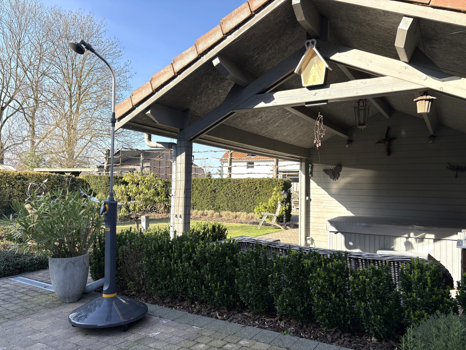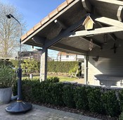 De aangelegde tuin is omheind en voorzien van een siervijver, een overdekt terras en 2 tuinhuisjes (waarvan 1 met jacuzzi). Verder zijn er 3 parkeerplaatsen, waarvan één onder de carport.